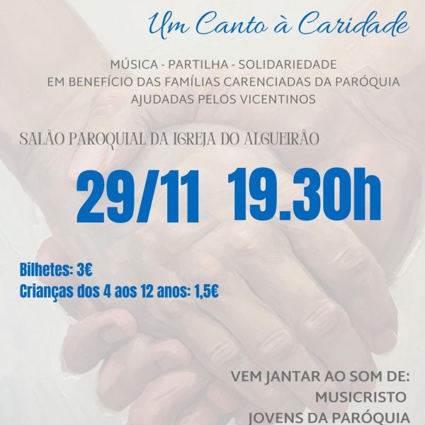 No dia 29 de novembro, às 19h30, no salão paroquial da Igreja do Algueirão, teremos um Café-Concerto Solidário em apoio às famílias assistidas pelos Vicentinos. Será uma noite cheia de partilha, alegria e esperança, com jantar, música ao vivo, a presença do MusiCristo e de jovens da nossa paróquia. É uma excelente oportunidade para ajudarmos […]