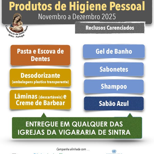 A Conferência de Santa Maria de Sintra (SSVP) tem uma iniciativa a “+ Conforto” nos meses de novembro e dezembro de 2025, direcionada a pessoas temporariamente privadas de liberdade (reclusos) que enfrentam dificuldades financeiras, impossibilitando-lhes a aquisição de produtos de higiene pessoal. O recluso como pessoa humana, criada à imagem de Deus Pai, não é […]