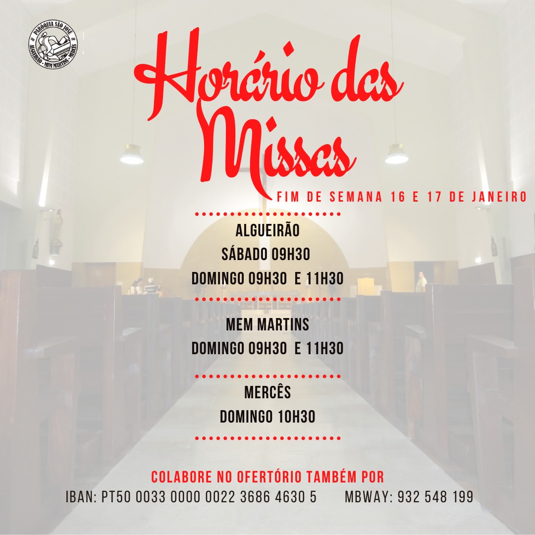 Horário das missas para este Fim de semana 16 e 17 de janeiro
