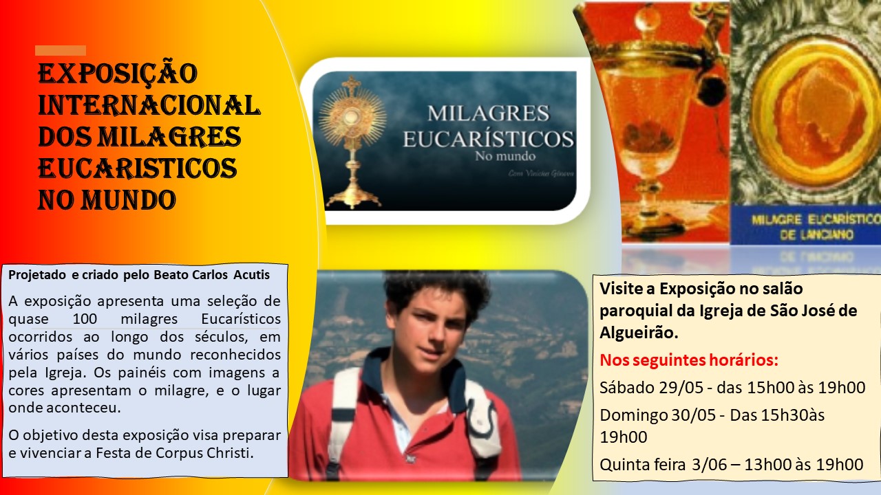 A exposição, projetada e criada pelo Beato Carlos Acutis, apresenta uma seleção de quase 100 milagres Eucarísticos ocorridos ao longo dos Séculos, em vários países do mundo reconhecidos pela Igreja. Os painéis com imagens a cores apresentam o milagre, e o lugar onde aconteceu.