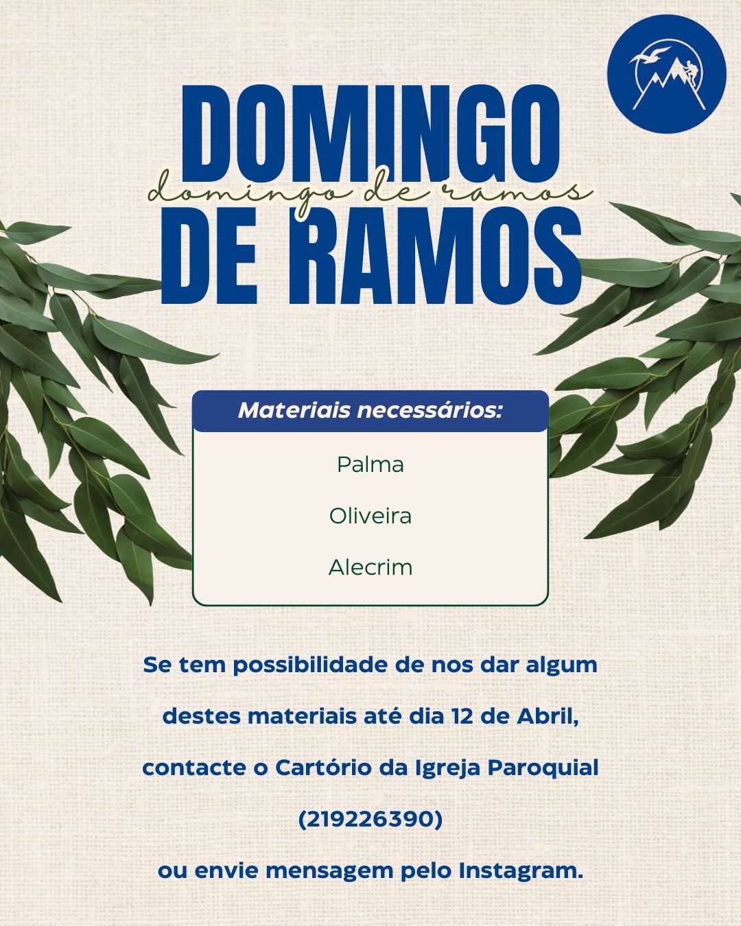 No próximo domingo, dia 13, será o Domingo de Ramos e, como é habitual, os jovens da nossa paróquia farão os ramos para serem distribuídos às portas das Igrejas. Para tal, necessitamos de material: oliveira, alecrim e folha de palmeira. Pedimos e agradecemos a