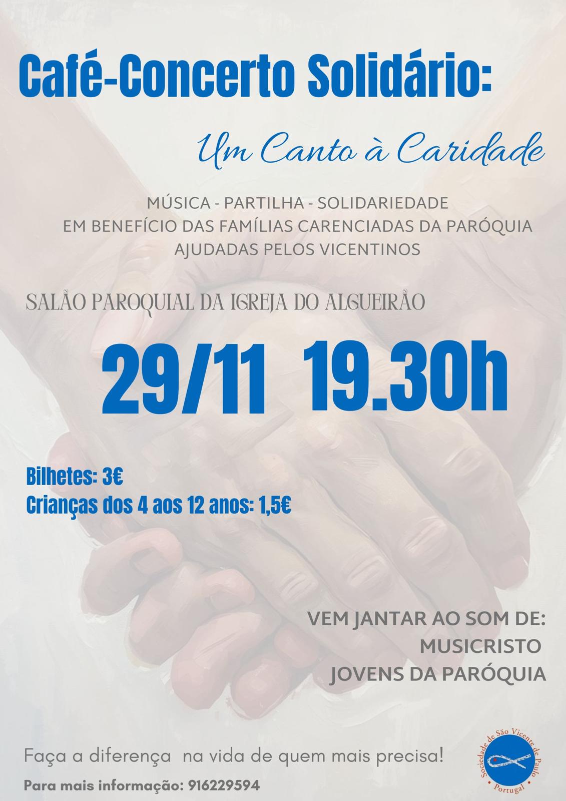 No dia 29 de novembro, às 19h30, no salão paroquial da Igreja do Algueirão, teremos um Café-Concerto Solidário em apoio às famílias assistidas pelos Vicentinos. Será uma noite cheia de partilha, alegria e esperança, com jantar, música ao vivo, a presença do MusiCristo e de jovens da nossa paróquia.
