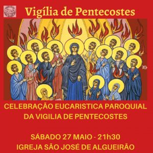 Sábado 27, às 21h30, na Igreja do Algueirão, celebração da Missa Paroquial da Vigília de Pentecostes, para invocar os sete dons do Espírito Santo. Participe.
