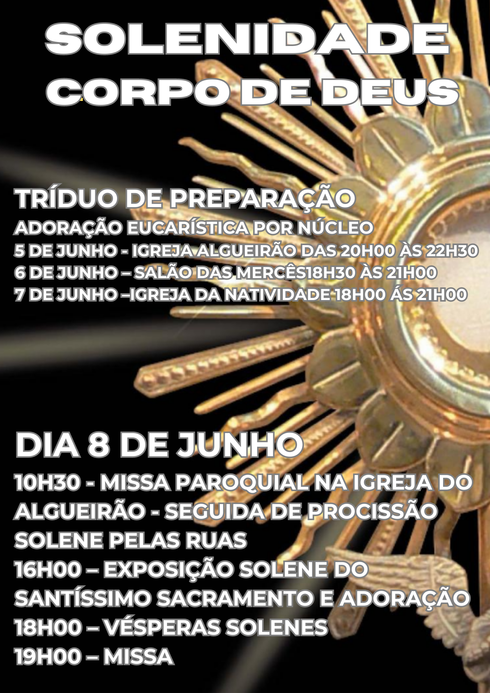 Depois da adoração às 21h seguirá a missa vespertina do Corpo de Deus, porque na quinta feira dia 8 não teremos Missas aqui na Igreja. Estamos todos convidados a participar da Missa Paroquial do Corpo de Deus ás 10h30 na Igreja do Algueirão, seguida de procissão.