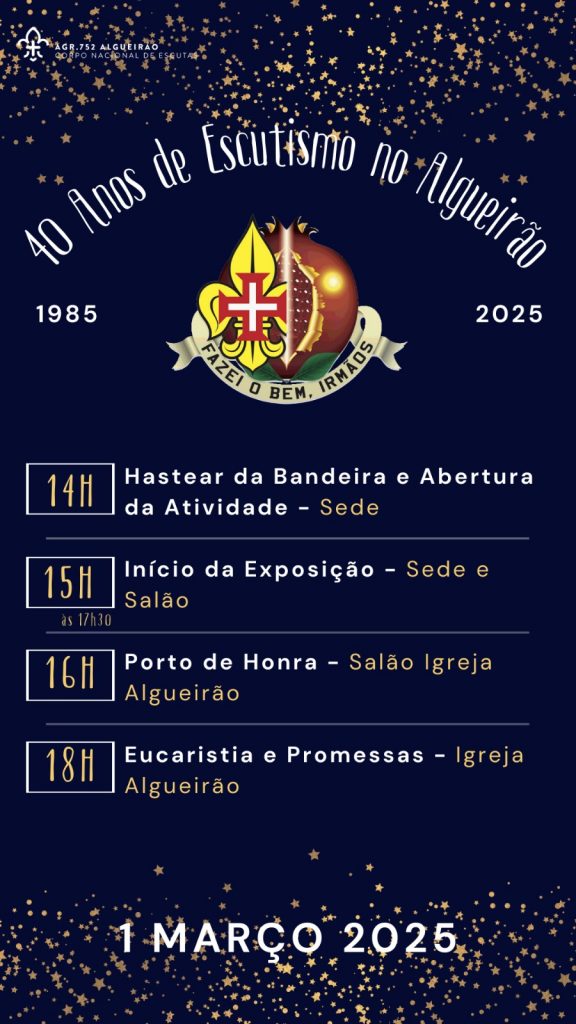 Sábado, dia 1 de março, o nosso Agrupamento de Escuteiros celebra 40 anos de atividade na nossa paróquia. Neste dia, estará connosco a celebrar este aniversário o Sr. Patriarca Dom Rui Valério, presidindo à Missa de Ação de Graças, na Igreja do Algueirão, que neste dia será, excecionalmente, às 18h, por isso será suspensa a missa das 19h.