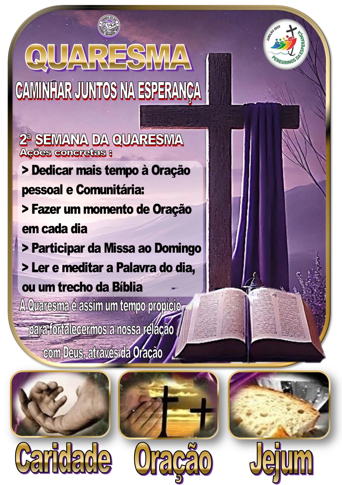 No nosso caminho quaresmal, a 2ª semana é marcada pelo tema da Oração: “Cultivar a esperança na oração”. A oração deve ser para o cristão «o respiro da vida espiritual”, a luz que ilumina o caminho e a força que sustenta. A oração torna-se, assim, a ponte entre o céu e a terra, um lugar de encontro onde o coração do homem e o coração de Deus se entrelaçam num diálogo de amor incessante. Na oração, descobrimos o quanto somos amados por Deus, e esta descoberta dá-nos esperança e coragem para viver o dia, para que os problemas que enfrentamos não sejam mais obstáculos à nossa felicidade, mas apelos de Deus, ocasiões para o nosso encontro com Ele.