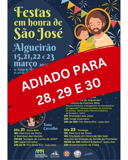 Informamos que as Festas em Honra de São José foram adiadas para os dias 28, 29 e 30 de março, devido às condições meteorológicas previstas.