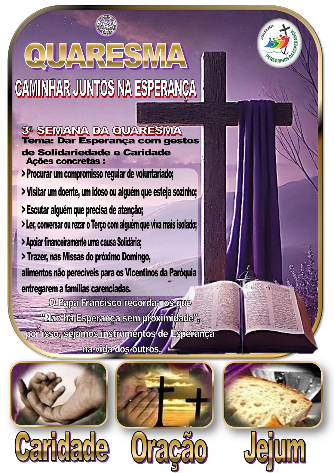 No nosso caminho quaresmal, a 3ª semana é marcada pelo tema: “Dar esperança com gestos de Solidariedade e Caridade”.